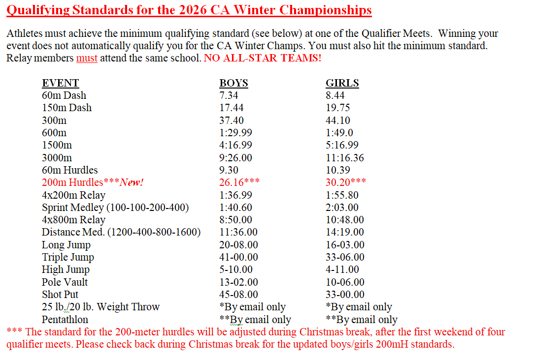 Process for reporting any improvements in your qualifying marks: ●The events at theFeb. 8Finals will be seeded based on marks achieved at Qualifier meets. ●If you attend an additional Qualifier meet and further improve your mark, you must report that improvement within 24 hours of the end of that Qualifier for thatnew markto be considered for seeding. Email improvement mark totrakn@yahoo.com. Please include your name, your assigned “Golden Bib” number, and a link to the results of your improved performance. Additional Rules / Regulations for the 2025CA Winter Championships ●Athletes compete unattached; however, all relay teams MUST be comprised of individuals attending the same high school. ●Participating athletes must bring two (2) signed waivers to the Winter Championships Finals on February 8th. These two waivers will be posted online when final entries are released. ●Teams consisting of athletes from multiple high schools will be disqualified.