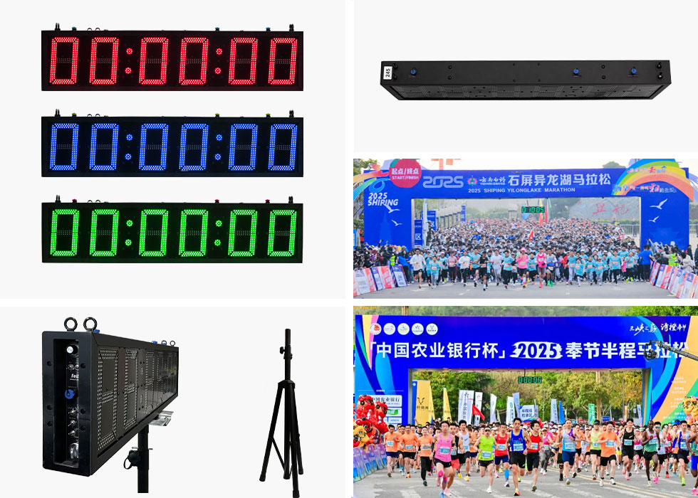 The Feibot FB2-LED clock uses high-brightness LED beads, with the ability to change the color and time of the beads through the switches. It allows for the synchronization of multiple clocks in real-time with precise timing, with an error of less than 0.05s. 1. Multiple color options: available in six colors. 2. Adjustable brightness levels: cater to different lighting preferences and environments. 3. High visibility: offers bright display with clarity. 4. Multiple control methods: supports phone app, starting gun control. 5. Energy efficiency: can use one side only. 6. Multiple functions: displays time and runner results, count up and count down, current time display, etc. 7. Backup power supply: supports external power supply to ensure extended battery life for endurance events. ALLOW 2-3 WEEKS DELIVERY TIME Time format: H:MM:SS (12/24 hour format) LED Dimensions: 920*250*90MM Digit Height: 197*123MM Brightness: 5%~100% Color: Red, Green, Blue, Yellow, Purple, cyan Power supply: Built in lithium battery, 12 VDC Battery life: 6 hours of operation at 50% brightness Connectivity: Bluetooth, cable Mounting options: On top of car, on tripod, on arch Control method: Smartphone app, starting gun Material: Aluminum & Steel LED weight: 9KG Metal box dimensions: 1015*375*140MM Metal box weight: 7KG WARNING: Products may contain chemicals known to the state of California to cause cancer, birth defects, or other reproductive harm. See www.P65Warnings.ca.gov for more info. |