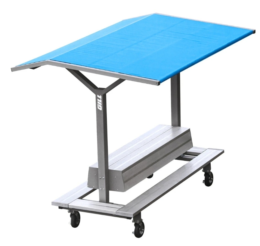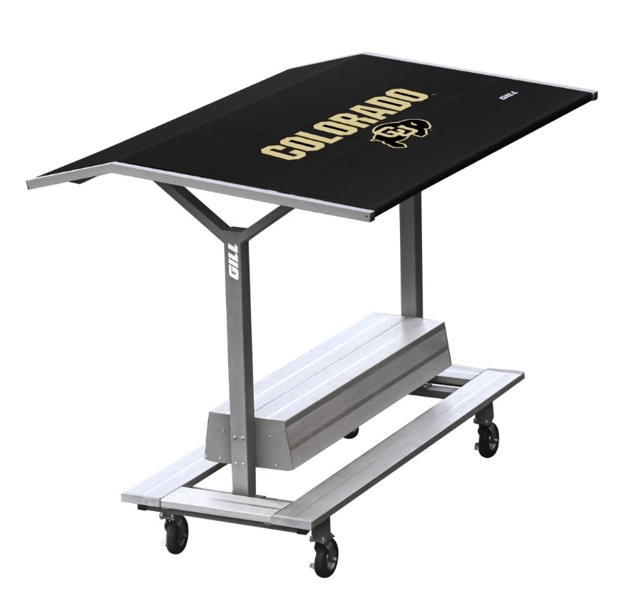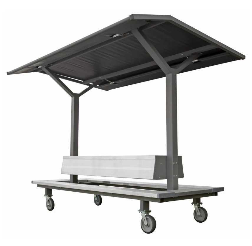 Portable Track Shelter has 360 degree seating that will seat 12 athletes comfortably. The custom graphic vinyl roof can be tensioned with turnbuckles to prevent water from pooling on top. The never flat wheels can be locked to prevent shelter from rolling out of position. The base and uprights are made from steel and the roof frame is made from aluminum. A shelf behind the backrests provides a spot for athletes to place their belongings.