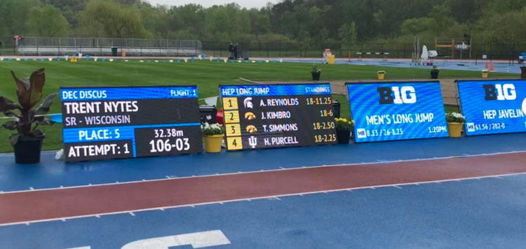 Infield displays can connect to a laptop or netbook to show live field event scores and measurements using the FieldLynx software. Finish line displays can connect to ResulTV for advanced broadcast-ready graphics Construction & Frame The premium aluminum alloy frame offers solid, weatherproof construction and a lightweight design. The optional flight case makes it easy to move the display within the infield or transport it between events. Because the display units are modular, a 2 panel display can easily be turned into a longer or taller display at a later date if necessary. Key Features