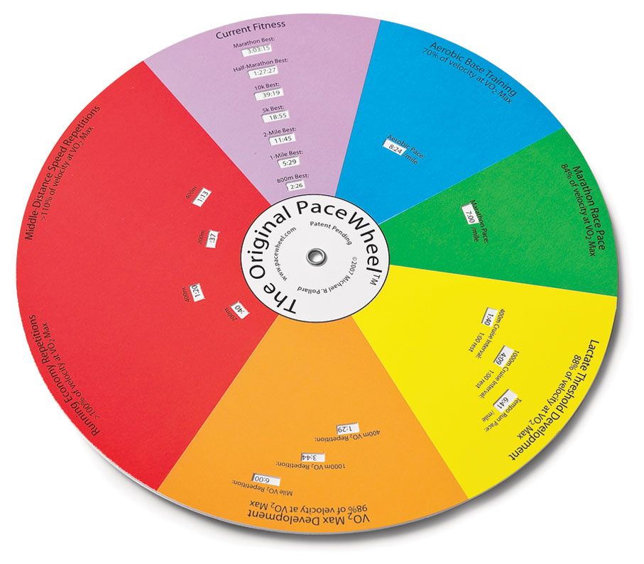 The Original PaceWheel is a circular calculator that provides the proper paces that athletes should train at in order to achieve the most progress towards their fitness and racing goals. The training paces provided are based on percentages of VO2 Max pace as calculated from an athlete's performance at a given distance. WARNING: Products may contain chemicals known to the state of California to cause cancer, birth defects, or other reproductive harm. See www.P65Warnings.ca.gov for more info. |